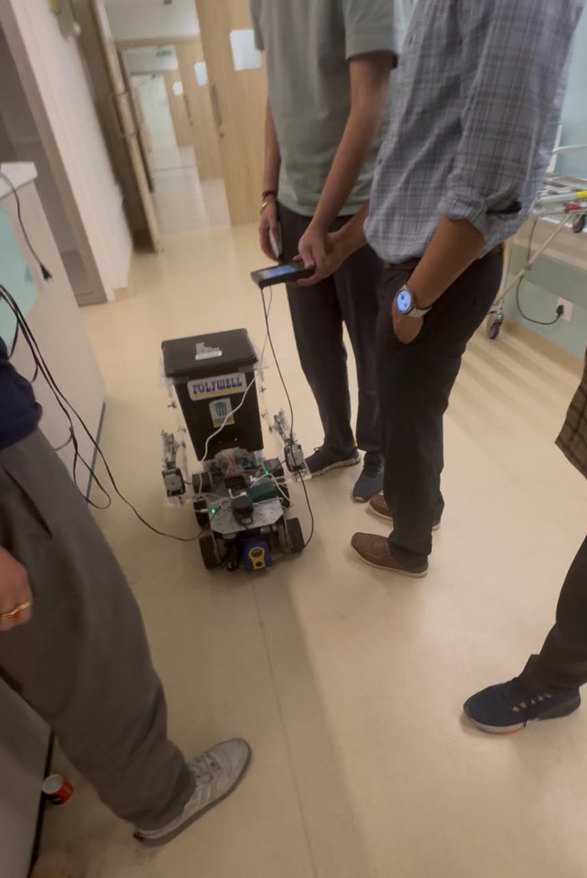 A structured experimental protocol was undertaken in controlled laboratory environments and subsequently at Altrus Healthcare, where the robot was tested in realistic operational settings. Trials revealed key implementation challenges, including torque differentials in ageing motors, chassis tolerance limitations, drift due to low-grip tyres, and occlusion of the LiDAR field of view by dustbins. Despite these constraints, the robot reliably executed bin recognition, lifting, and transport tasks. A qualitative survey of hospital staff indicated strong support for future robotic integration in healthcare and recognised this prototype as an essential proof-of-concept. The findings inform the next iteration, which will feature improved actuation, onboard waste consolidation, and enhanced autonomy.
