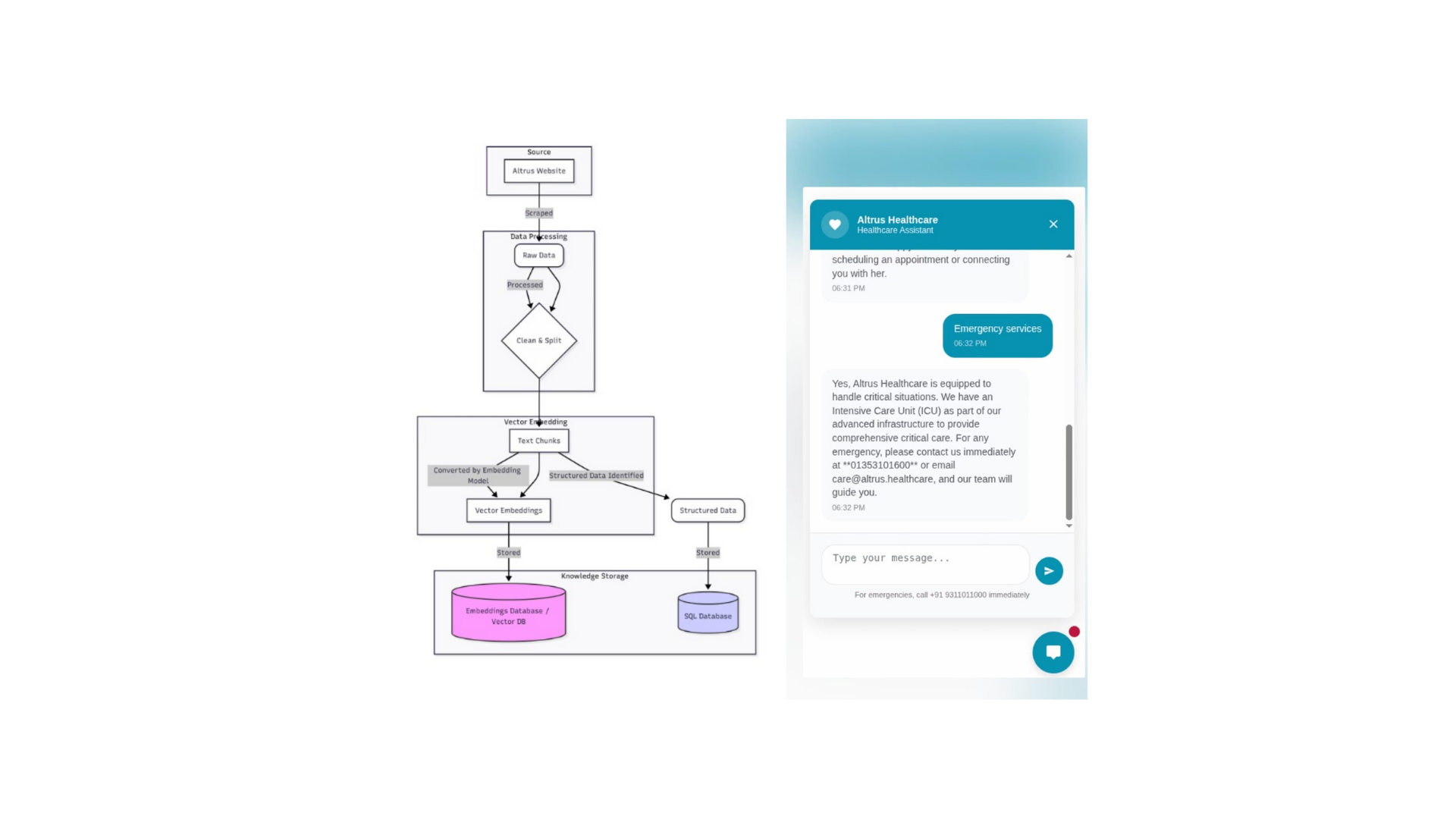 The dataset was acquired by scraping and parsing the Altrus Healthcare website to construct a domain-specific knowledge base. Pre-processing involved text chunking and vector embedding generation to create a searchable semantic index. A RAG architecture was chosen over standalone LLMs to dynamically retrieve structured data (like doctor schedules), thereby minimizing hallucinations and enabling the system to provide factual, verifiable responses.