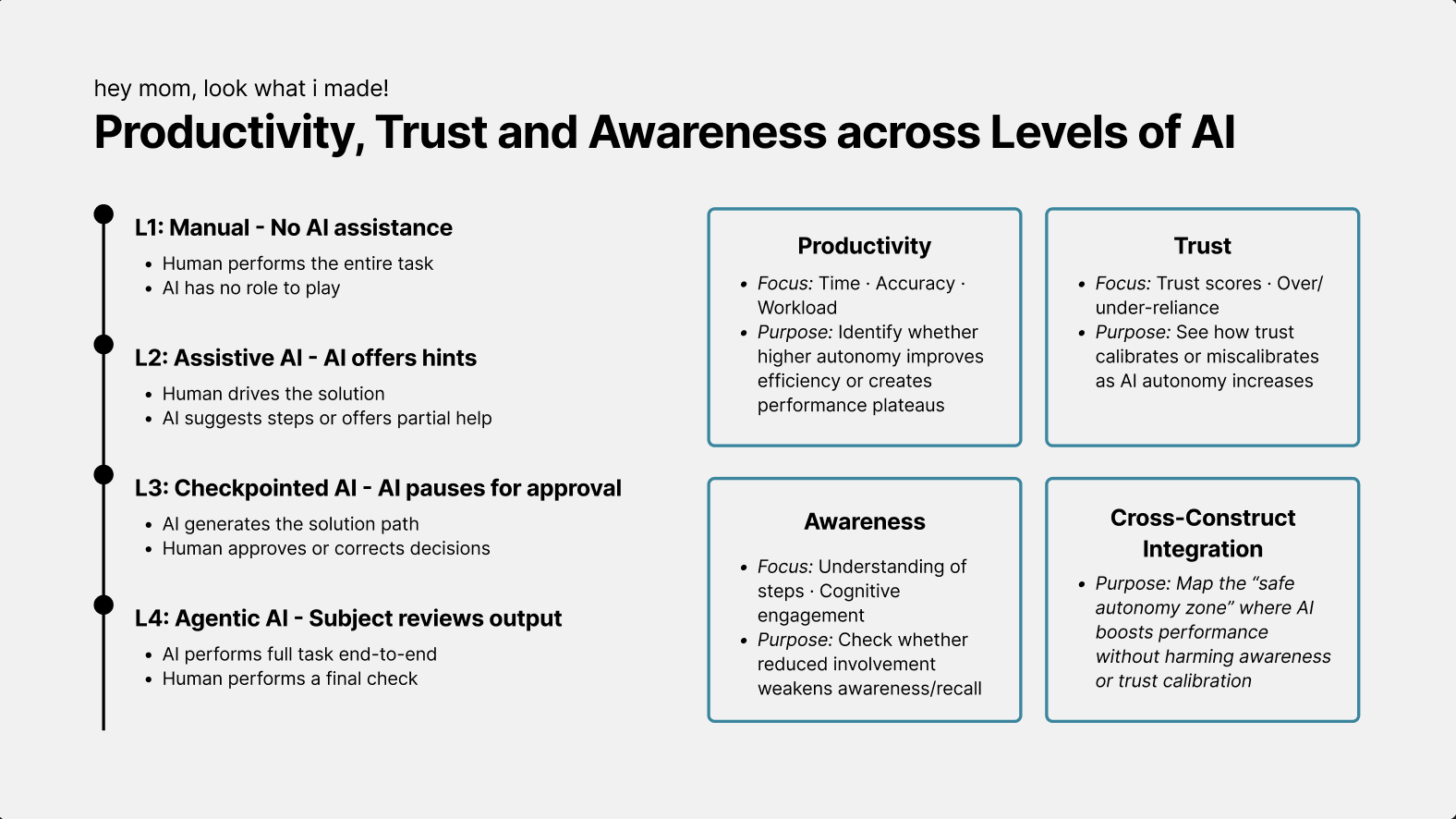 The study uses NASA-TLX (for workload), Likert-scale trust measures, and objective task metrics (time, errors, dependency patterns) to quantify outcomes. The analysis aims to determine how autonomy shifts influence the balance between user confidence, cognitive effort, and task performance ultimately informing the design of more safe, reliable, and user-aware AI systems.