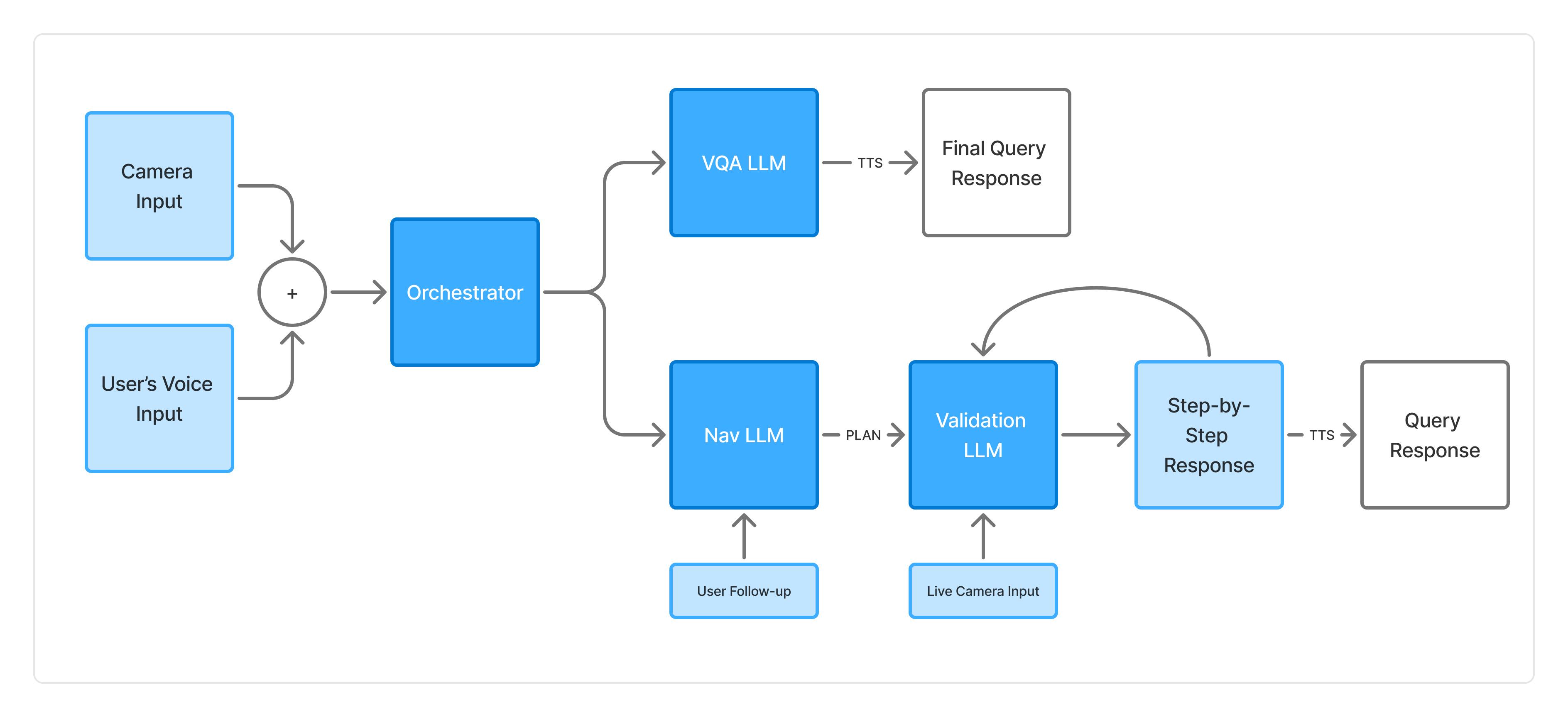 Performance is evaluated through objective metrics such as VQA accuracy and Success weighted by Path Length (SPL), alongside subjective feedback from sighted and blindfolded individuals to assess real-world utility. Preliminary baselines indicate that smaller, efficient models can outperform larger counterparts in single-image understanding, achieving an average SPL score of 0.66 in simulations. This solution significantly enhances accessibility by providing a seamless, hallucination-resistant navigation aid capable of operating proactively in real-time.