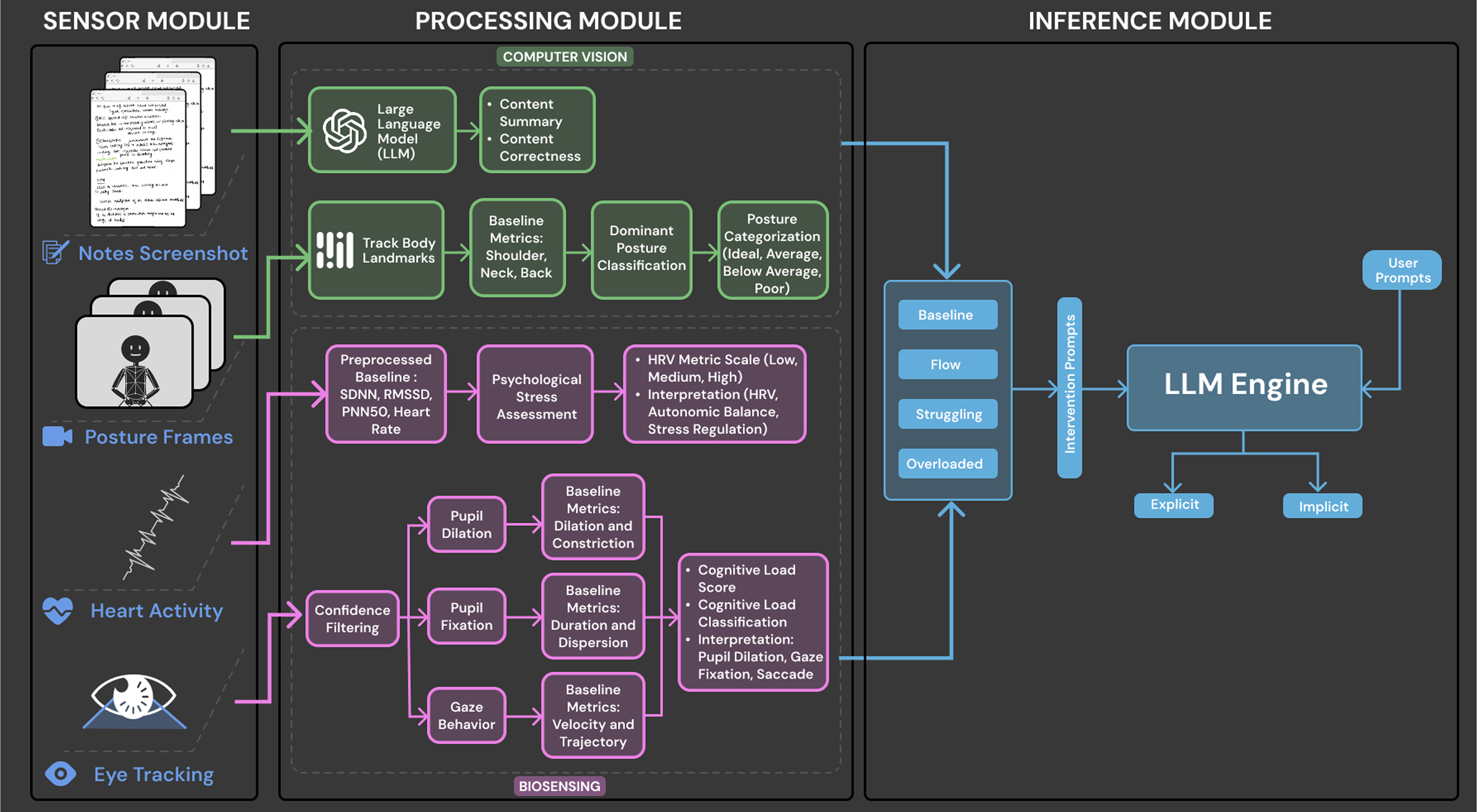 The methodology involved a formative study (N=66) followed by a controlled lab experiment (N=25) to collect physiological and behavioral data. We employed computer vision algorithms to track body landmarks for posture classification and signal processing techniques (RMSSD, SDNN) to interpret physiological stress signals in real-time. These lightweight algorithms were selected to minimize latency, enabling immediate, seamless intervention without the computational overhead of complex deep learning models.