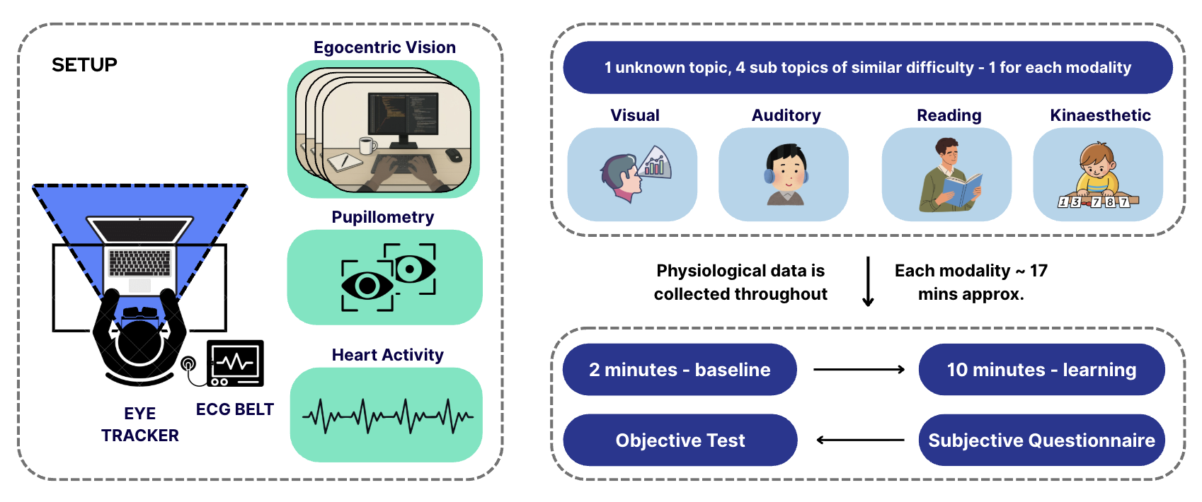 Conventional research on learning styles relies largely on self-reported preferences and overlooks the physiological effort associated with learning. This study investigates whether instructional modality influences objective performance and the ease of learning, using multimodal physiological biomarkers to quantify cognitive load. Nine participants engaged with three instructional modalities—reading, audio, and kinesthetic—across three cell-biology topics of comparable difficulty. Eye-tracking and ECG data were collected continuously, alongside subjective workload (NASA-TLX) and satisfaction ratings. A composite metric, Learning Ease, was developed by standardizing subjective workload and satisfaction with physiological markers (Δ heart rate and Δ pupil diameter). Repeated measures ANOVA and non-parametric tests showed no significant effect of modality on either objective performance or Learning Ease. However, Learning Ease was positively correlated with performance (R² = 0.58), indicating that reduced cognitive strain supports better outcomes. A significant interaction was observed between modality and topic order (F(8,18) = 2.87, p = 0.03), demonstrating that modality effectiveness depends on context, such as fatigue. These findings shift the focus from static learning styles toward adaptive learning strategies that align modality with the learner’s cognitive state and session phase.